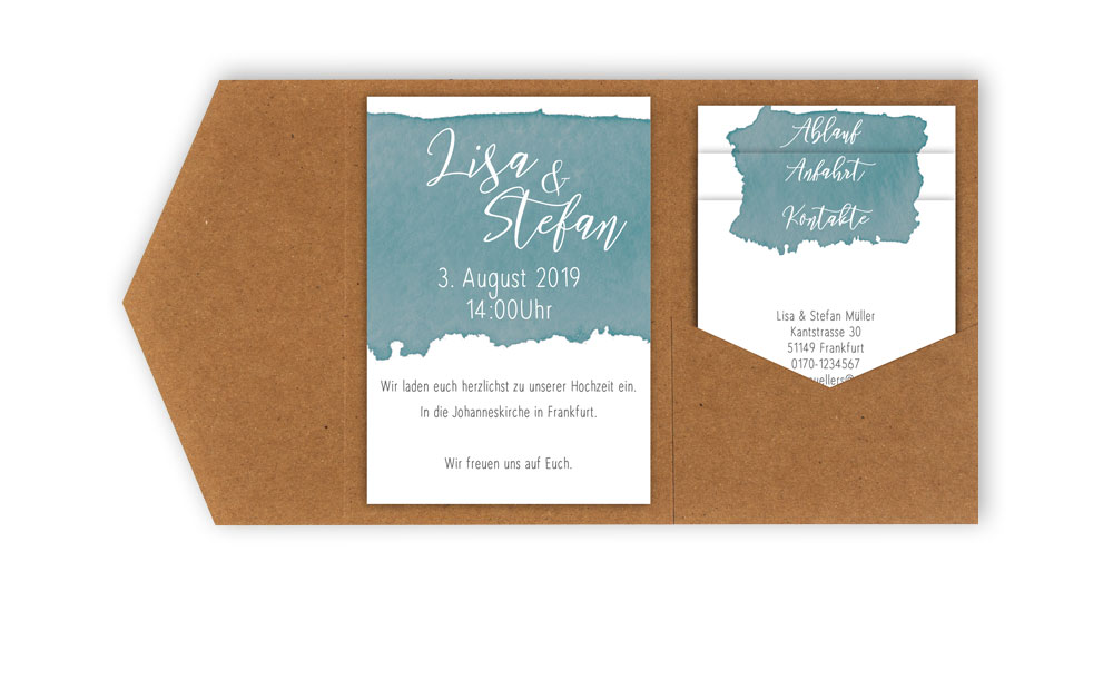 Sie erhalten mit diesem Musterpaket unsere Pocketfold-Karte im Format A5 hoch mit unterer Tasche blanko ohne Einleger und Backing Card.